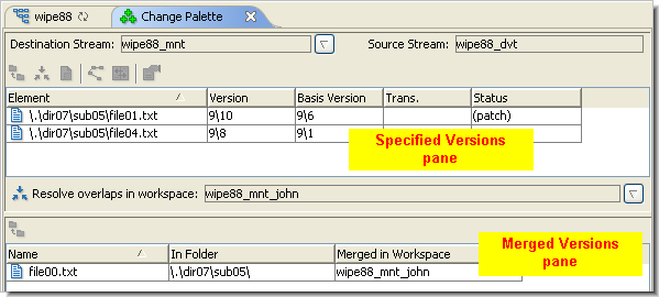 • The Specified Versions pane initially lists all the versions you specified with Send to Change Palette (or the drag-and-drop operation). The versions' entries are cleared from this pane as you work with them using Promote, Merge, Patch, etc.
