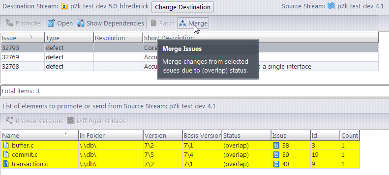 • (overlap) indicates that you must perform a Merge prior to promoting this element to the destination stream. You can also perform a Patch to propagate some of this version's changes to the destination stream, but this does not resolve the overlap status (and so does not enable Promote).