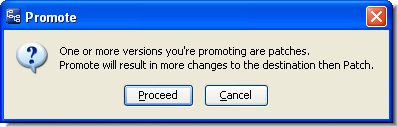 • (patch) indicates that the change that you sent to the Change Palette for this element (as specified by its entries in the Version and Basis Version columns) is a patch. That is, the change does not include the entire set of changes between the source-stream version and the closest common ancestor of the source-stream and destination-stream versions. You can perform a Patch operation to propagate the changes in the patch to the destination stream.If the element does not also have (overlap) status, the Promote command is enabled for this version, too.But promoting would propagate more changes to the destination stream than were loaded into the Change Palette. AccuRev issues a warning if you invoke Promote on this version.