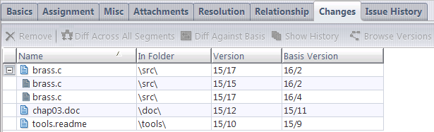 In the Changes subtab of an issue record's form (and equivalently, in a Stream Issues tab), a change package is displayed in a table, each row showing one change package entry. Example:An element that has been promoted against different issues intermittently is displayed with a plus (+) sign, which expands to display all the segments that are included in this change package.