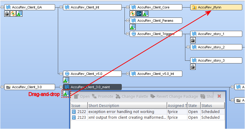 As stated above, you generally do not need to invoke the Change Palette manually: just drag and drop the element versions or issues that you wish to cross-promote, and AccuRev will determine whether or not you need to use the Change Palette to complete the operation. But if you want to send something to the Change Palette manually, here is how you do it. For files, see the next section. For issues, see Issue Mode on page 250.The current development activity subwindow shows what is currently taking place in a stream or workspace -- by element, by transaction, or by issue record. In this subwindow, you can:
