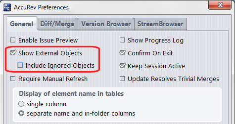• Display the object's simple name (Name column) separately from the pathname to its parent directory (In Folder column).In Tools > Preferences, use the Display of element name in tables preference to make this choice. It affects all instances of the File Browser, along with other tools that display element pathnames.Tip: You can add and remove columns in the Details pane as you would with any other table in AccuRev. See Working with Tables on page 14 for more information.By default, the Details pane of the File Browser shows both elements and external objects. The Show External Objects preference provides an all-or-none control over the display of external objects -- even those external objects you might have instructed AccuRev to ignore when they match a user-specified ignore pattern.If you also want AccuRev to display ignored external objects, select the Include Ignored Objects preference, too.See AccuRev Preferences (Tools > Preferences Command) on page 39 to learn more about setting preferences in AccuRev. See Chapter 3 Specifying Ignore Patterns for External Objects in the AccuRev Technical Notes for more information and examples of how to specify ignore patterns.As described previously, you can customize the File Browser to suit your needs -- you can choose which columns you want to display, and in which order; you can change the relative widths of the Explorer and Details panes; and you can choose to hide the Diff pane in the modes that support it, for example. The Save Layout button () lets you save these and other changes you make to default File Browser layout settings as a personal preference. Once saved, AccuRev uses your customized layout settings the next time open a new File Browser.