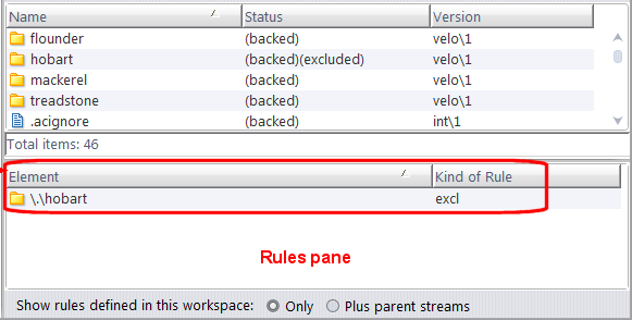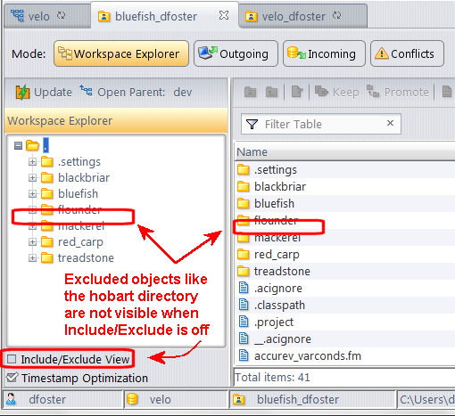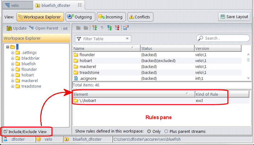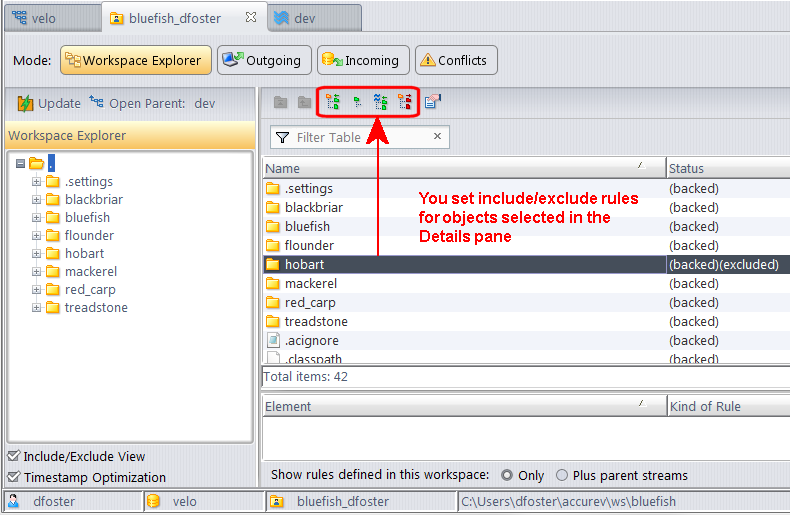 This section describes how to use the Explorer mode’s Include/Exclude View to choose the subset of directories and files you want to make available in a given workspace.To display the Include/Exclude View, select the Include/Exclude View check box at the bottom of the Explorer pane.When the Include/Exclude View is active, AccuRev adds another pane to the Details pane. The Rules pane displays any elements for which an include/exclude rule has been defined, as shown in the following illustration. If you are viewing a workspace or stream for which no rules have been defined, the Rules pane is empty.Tip: The Include/Exclude View check box setting is saved as a user preference in AccuRev’s preferences.xml file. The setting is applied to all workspaces and streams you subsequently open in the File Browser, though you can change it any time you wish.In Include/Exclude View, both the Explorer and Details panes show all elements in the workspace or stream. For example, if the top-level directory hobart is excluded, it still appears in both the Explorer and Details panes in Include/Exclude View, as shown in the preceding illustration. You can navigate into an excluded directory as you would any other. Its elements will have a status of (backed)(excluded).Excluded directories and files are not displayed in the File Browser when Include/Exclude View is turned off, however -- notice that the directory hobart does not appear in the following illustration:In the Include/Exclude View, the Details pane toolbar and context menu change to support operations associated with this view -- setting and removing include/exclude rules. A few of the standard toolbar buttons remain, to aid you in navigating the depot and determining element history. Commands for typical AccuRev operations -- Keep, Promote, and Merge, for example -- are not applicable in this view, so they are not displayed.Make the selected directory elements, but not any of the elements within the directory, appear in the workspace or stream. You can set additional Include or Include Directory Only rules to make part of the directory's contents appear.A depot contains a tools subdirectory, which contains a src subdirectory, which contain a scripts subdirectory, which contains two subdirectories, perl and python. If you need only the python subdirectory, not the rest of the tools subtree, use these commands: