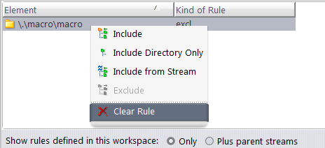 3. Right-click the rule, and select Clear Rule from the context menu.To leave Include/Exclude View in a workspace or stream, clear the checkbox at the bottom of the Explorer pane. The Rules pane disappears, and the Details pane reverts to displaying data for the current workspace or stream. Note that any elements that have been excluded are not displayed. See How Include/Exclude View Affects the File Browser Display on page 105 for more information.