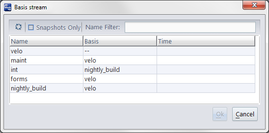 • The Refresh button contacts the AccuRev Server to refresh the list of streams displayed in the Basis Stream dialog box.