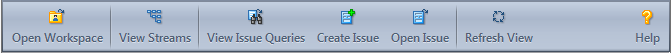 The GUI Main Toolbar The main toolbar gives you quick access to commonly used features: From left to right, the icons are: Open Workspace See: Opening a Workspaces Tab on page 32 View Streams See: Opening a StreamBrowser Tab on page 145 View Issue Queries, Create Issue, Open Issue See: Creating AccuWork Queries on page 309, and Working with Issues on page 287 Refresh See: Refreshing Tabs on page 11 Help See: Overview of the On-Line Help on page 1
