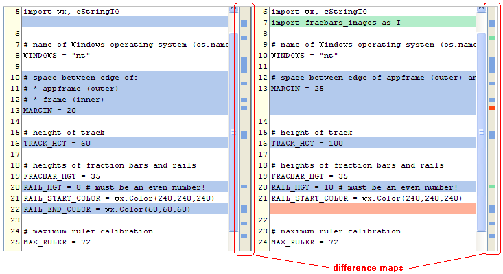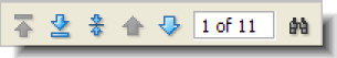 For a text file that contains hundreds or thousands of lines, there may be only a few difference sections (added, deleted, or revised), separated by large unchanged sections. The Diff tool provides both navigation buttons on its toolbar and a difference map for direct access to a particular difference section.Whenever you use one of these buttons to jump to a particular difference section, the Diff tool remembers it as the current difference and highlights the lines numbers in both panes.(Keyboard shortcut: Ctrl+F) Search for a text string, in either of the versions being compared. A dialog appears, in which you define the search.After you've defined a search, you can perform it again, using the command File > Search Again on the GUI window's main menu, or its keyboard shortcut: function key F3.To the right of each pane, there's a difference map that shows the relative locations and sizes of all the difference sections. The maps use the same color-coding (see Color-Coding of the Contributor Versions on page 217) as the difference sections themselves. Click on any colored area within a map to scroll both panes directly to the corresponding difference section. (Actually, you can click anywhere in the difference map; the panes will scroll to that location, even if the files are identical there.)If you use a difference map, but then want to scroll back to where you were before, click theCenter Diff toolbar button.