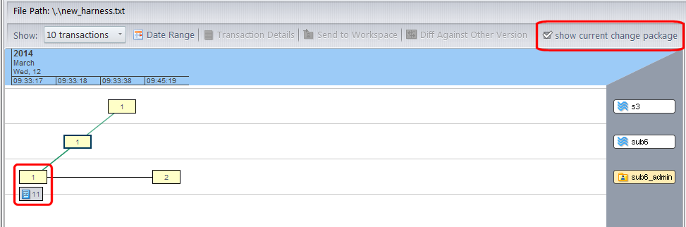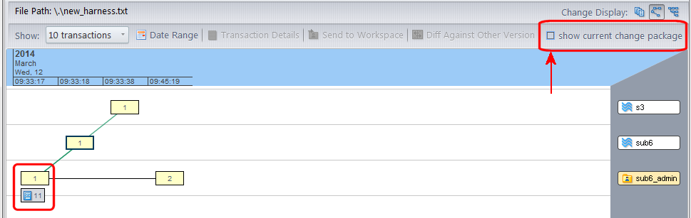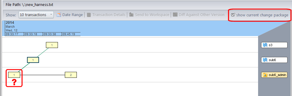 Imagine new_harness.txt is subsequently removed from the change package. If you view the Version Browser at that time, you will see that it no longer displays a change package for version 1 of new_harness.txt: