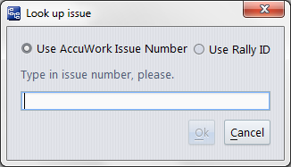 1. Tip: The Open Issue button is also available on the Query Results pane toolbar. See Query Tab Layout on page 310 for more information.Tip: If you have implemented third-party issue tracking system (ITS) keys in your AccuWork schema, this dialog box displays a pair of radio buttons that let you indicate whether you want to use AccuWork issue numbers or third-party ITS keys when looking up issues. See Using Third-Party Keys in the AccuRev GUI on page 408.The Issue form for the issue you specified appears. See Issue Form on page 294 for more information on the form.A typical AccuRev repository contains multiple depots. Each depot can have its own AccuWork configuration. In each depot, the issue records are numbered sequentially: 1, 2, 3, ... The Create Issue or Look Up operation applies to the current depot.AccuWork can be configured to use a lookup field other than the default (field name issueNum, field label Issue). In this case, the label for the configured field appears in the prompt window, and you must enter a value that exactly matches (except for uppercase/lowercase) some issue record's value of that field.Cloning an issue creates a new issue record based on the issue you have chosen to clone. You might want to clone an issue when it contains a lot of information that is relevant to the new issue you want to create and you do not wish to recreate this information manually.