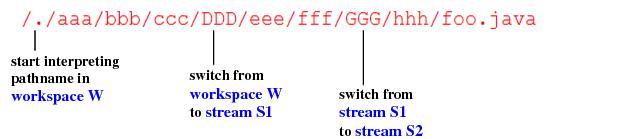 files make this namespace-switching transparent: AccuRev shows you the element names and pathnames that will enable you to access the data from your current workspace or stream context.