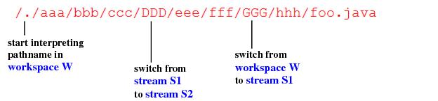 S as the target stream. AccuRev will process the pathname, component-by-component, as illustrated here: