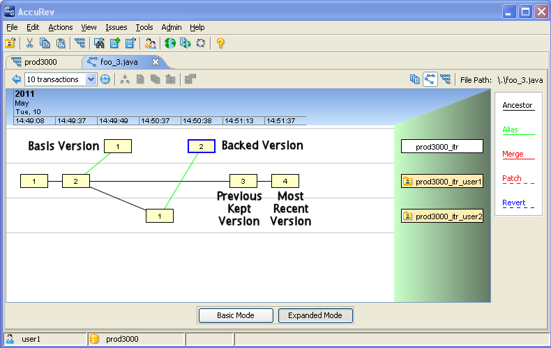 Revert to... also offers a “Most Recent Version” option, it is easy for new users to be confused by these different features. This section illustrates the differences between Backed and Basis versions of an element, and what a user can expect from various AccuRev GUI commands.