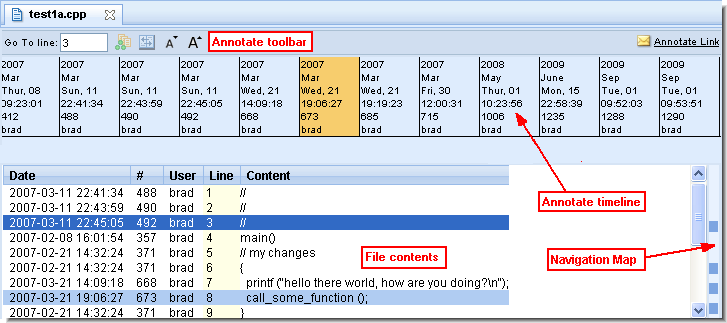 You use the Annotate command to explore how a text file has changed over time. You cannot use annotate with binary files.The file contents pane displays all the lines of the file as of the currently selected transaction. Each line appears on its own row. Lines whose content was modified as of that transaction are highlighted. The navigation map, to the right of the vertical scroll bar, shows the relative locations and sizes of the areas in the file that were modified at the time of the currently selected transaction. Click on any point within the navigation map to scroll directly to that area in the file.