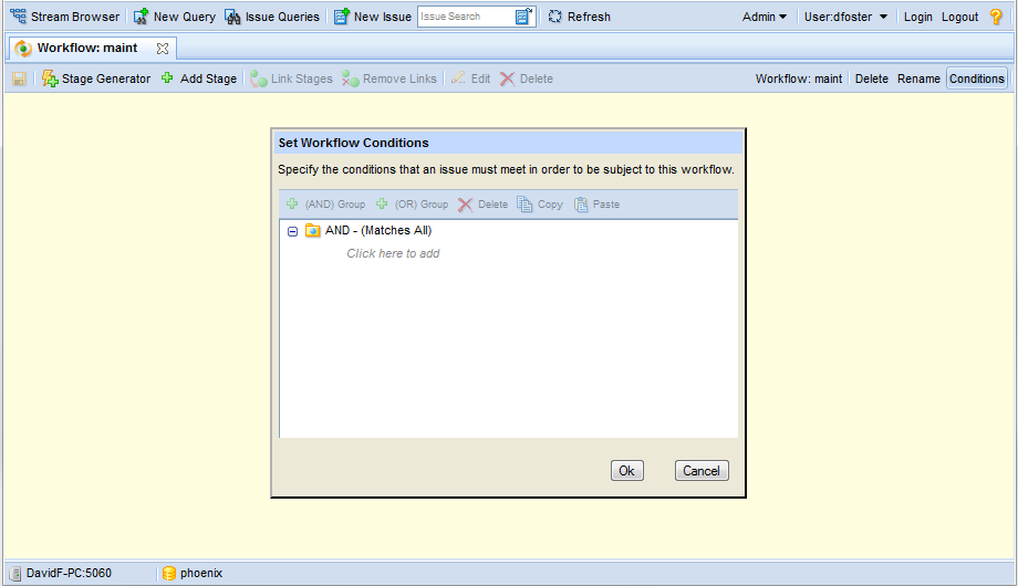 4. Click Ok.If you want to specify workflow conditions now, see Activating a Workflow: Defining Workflow Conditions on page 135. To specify them another time, click Cancel.The workflow is empty by default. To get started defining your workflow, see Creating and Managing Workflow Stages on page 138.In order for AccuRev to use a workflow for issue process automation and SCM policy enforcement, you must activate the workflow. You activate a workflow by defining one or more conditions that identify the issues are subject to it. For example, you might decide to create a workflow to manage issues that are defects. In this case, you would define the condition for the workflow as Type = Defect. Thereafter, any issue in the depot whose Type field has a value of Defect is subject to the rules defined in that workflow.Note: The conditions you specify for a workflow must be unique for all workflows within a depot.You define workflow conditions using the Set Workflow Conditions dialog box, as shown in Step 4 in Creating a Workflow on page 134. Workflow conditions can be defined using any simple or compound clauses you need, including nested AND and OR statements.The Set Workflow Conditions dialog box has the same features and uses the same mechanics as the AccuRev Web UI Query Builder. See Working with the Query Builder on page 64 for more information.You can display the Set Workflow Conditions dialog box for any open workflow by clicking the Conditions button on the Workflow Editor toolbar.