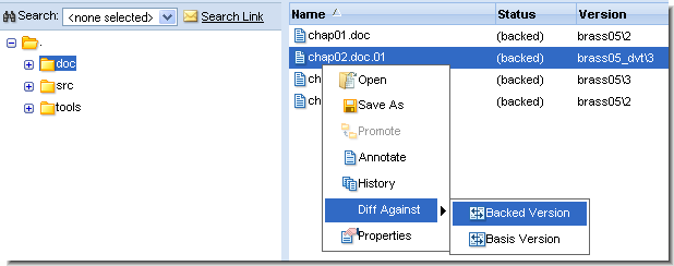 • Against the previous version in the file's transaction history, via the Versions pane in the History Browser and Displaying Active Transactions.