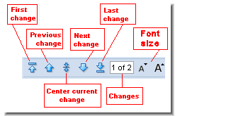 The navigation map, to the right of the vertical scroll bar, shows the relative locations and sizes of the areas that differ between the two files. It uses the same color-coding as the difference sections. Click on any point within the navigation map to scroll directly to that area in the file.The right side of the toolbar contains two buttons that allow you to toggle betweenContext Diff and