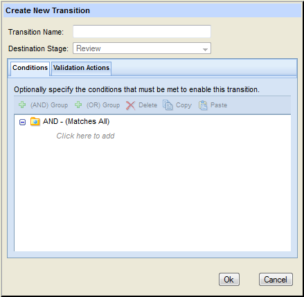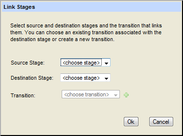 Tip: You can also use the Link Stages dialog box to create a new transition for the destination stage. See Linking Workflow Stages Using a New Transition on page 153 for more information. You can also create a transition at the same time you create the link. See Linking Workflow Stages Using a New Transition on page 153.