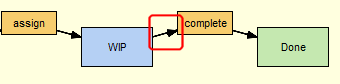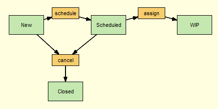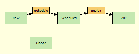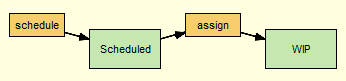 In AccuRev, you use a transition to link one workflow stage to another. The stage from which you are linking is referred to as the source stage; the stage to which you are linking is referred to as the destination stage. In the following illustration, Scheduled is the source stage; it is linked to WIP, the destination stage, by the assign transition:Here, only the WIP stage is currently being used as a destination stage. The Scheduled stage currently has no source stages linked to it via the schedule transition.The destination stage in a pair of linked workflow stages must have a transition associated with it—without it, there is no way for an issue to enter that stage using workflow transitions. In the following example, the Closed stage cannot currently be used as a destination stage because it does not have a transition associated with it:Once the Closed stage is associated with a transition, called cancel, for example, issues can move to it through the workflow from either the New or Scheduled stages, as shown here:Note that a destination stage can be referenced by more than one source stage. In addition, a destination stage may have more than one transition associated with it. You might want to set up your workflow such that an issue can move from WIP to Closed via a complete transition, for example.