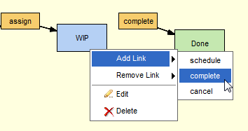3. In the workflow diagram, right-click the workflow stage you want to specify as the source stage and choose Add Link from the context menu.AccuRev links the source stage you specified in Step 3 with the destination stage associated with the transition you specified in this step. For example: