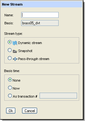 • Now: The basis time is set at the time the stream is created. The new stream inherits the versions currently in its parent stream but does not inherit any subsequent versions promoted to its parent. Streams with a Now basis are similar to Snapshot streams in this regard, but you cannot promote into a Snapshot. You can promote into a stream with a Now basis.