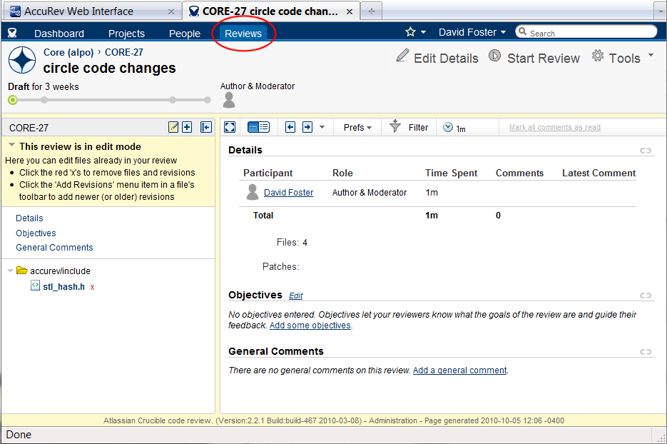 5. Click Add.Note: Your Crucible administrator must create a Crucible user account using your AccuRev user identity. See your Crucible administrator if you have trouble logging in to Crucible.If your AccuRev system administrator has configured AccuRev as a Crucible plug-in, the Code Review button () appears in the Web UI toolbar, as shown in the following illustration.