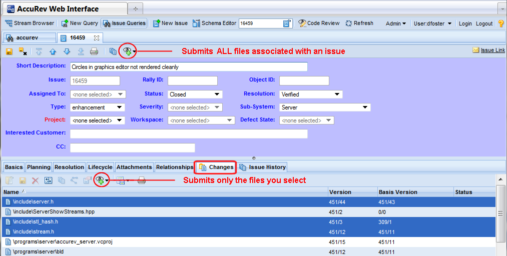• My Changes: Compares the workspace version with the common ancestor in the backing stream. This option is useful for files that have an (overlap) status because it identifies the changes in the workspace that did not come from the backing stream. The My Changes option is the equivalent of diffing against the last version that you merged with.Notice the two Code Review buttons () highlighted in this particular view -- one on the Issue Edit form toolbar, another on the Changes subtab toolbar. AccuRev responds differently depending on which button you click: