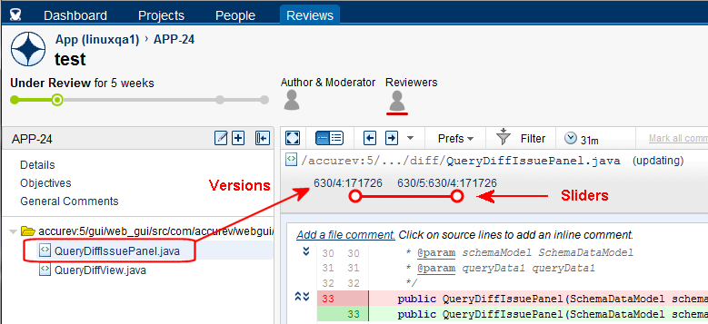 • Clicking the Code Review button on the Issue Edit form toolbar submits to review all the elements associated with the current issue, regardless of whether or not you have selected any elements on the active subtab.