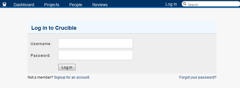 To start Crucible from within AccuRev, click the Code Review button (). Crucible opens in a new Web browser instance, displaying the login page.