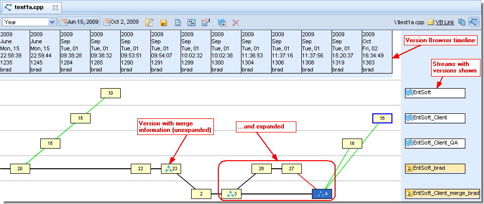 If no black line connects directly to the version on the left (for example, EntSoft_Client\15 in the image above), that version is the virtual ancestor of the version on the right. The version to the left has undergone a merge operation to become the version on the right. The version to the left has undergone a patch operation to become the version on the right. The version to the left has undergone a revert operation to become the version on the right.