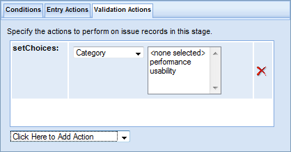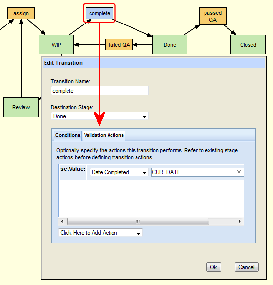 The Stage Generator automatically creates the stage actions required to create a functional workflow. There might be occasions, however, when you need to specify additional actions to enforce your desired workflow process. For example, you might decide that you want the complete transition to set the Date Completed field to the current date. You would do this by specifying the setValue action on the Validation Actions tab for the transition, as shown here: