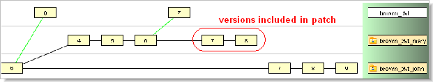 When John patches version brown_dvt_mary/8 into his workspace, AccuRev decides that only the versions since the promotion — versions 7 and 8 — contain "recent changes". The idea is that a promotion typically marks the end of a programming task, not an intermediate checkpoint.