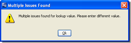 AccuRev guarantees uniqueness of the issueNum field value only. It allows duplicate values in all other fields. Be sure to specify an alternative lookup field whose values are rendered unique by some other mechanism. If a user performs a lookup on a non-unique value, an error occurs: