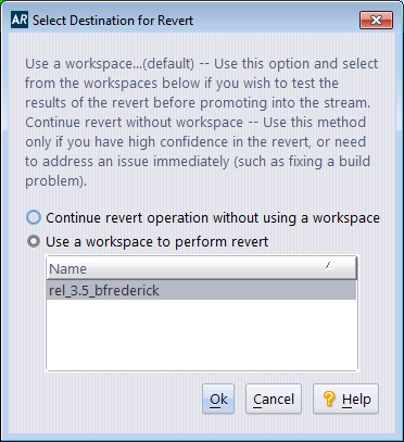 Use a workspace to perform revert — Choose this option if you wish to test the results of the revert before promoting them back into the stream. You must choose a workspace to which you have access to perform the revert. (All workspace appear in the selection list. If you select a workspace to which you do not have access, AccuRev will display an error). The revert operation typically involves one or more reverse patch operations on file elements' contents, performed with the Merge tool.