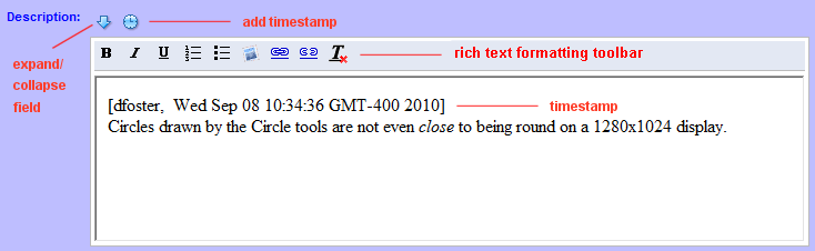 Rich text is typically enabled by the AccuRev administrator. See “Appendix B, AccuWork,” in the AccuRev On-Line Help Guide for more information.If a field has been defined with a Log datatype in the AccuRev Schema Editor, the Web UI displays the Add Timestamped Text button (). Clicking this button adds a timestamp to the top of the field. The timestamp format is AccuRev username, day, date, time, time zone, and year, as shown in the following example: