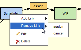 3. In the workflow diagram, right-click the workflow stage you want to specify as the source stage and choose Add Link from the context menu.AccuRev links the source stage you specified in Step 3 with the destination stage associated with the transition you specified in this step. For example: