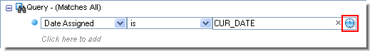 8. The query builder is the tool you use to add and modify clauses in new and existing queries. This section describes editing operations supported by the query builder.The point-and-click interface makes creating a simple clause easy. Start by clicking one of the Click here to add links in the query to add placeholders for each part of the clause.First, select a field name from the list box containing all the field names. When you select the field name, the Query Editor automatically adjusts the available values for the other parts of the clause, based on the values allowed (see Allowed Comparisons and Values) for the selected field.In the example below, the user has selected the Submitted By field, and is contemplating which comparison operator to choose.Note that the comparison operators <is in> and <is not in> allow multiple values to be selected. After you select the operator, the options appear in a list box, from which you can make multiple selections. The completed clause contains all the selected values, separated by commas, and the individual values are considered to be combined with an OR.Therefore, the query displayed below would be read as "Show all issues for which the date submitted is after or equal to April 1, 2009 at 14:52:14, AND the issue state is Complete or Verified."Note: Date fields contain an icon that inserts the cur_date variable into the value field. This variable ensures that the clause will refer to the current date when the query is being accessed.A compound clause combines any number of simple clauses, using the same logical operator: AND or OR. (The NOT operator is not supported.) You can combine both simple and compound clauses.The query builder automatically creates placeholders for simple clauses, but you must explicitly insert a compound-clause placeholder yourself. To do so, select the query title or an existing AND or OR statement, and click one of theor