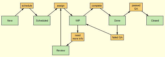 transitions, which are represented as orange rectangles; arrows show how transitions move issues from stage to stage through the workflow, as shown in the following illustration: