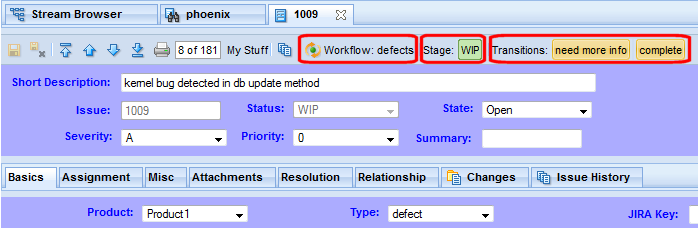 WIP) displays a read-only version of the workflow diagram. Only those transitions that are applicable to the current stage are displayed, allowing easy enforcement of your workflow process rules.