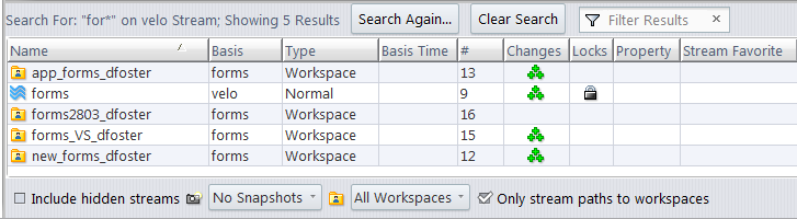 The StreamBrowser search feature enables you to find a stream or workspace whose name contains a specified character string. You can use this feature in any of the StreamBrowser's display modes: