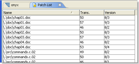 The Patch List tab lists all the individual versions whose changes need to be sent from one stream (or snapshot, or workspace) to another, so that the second stream will include all the changes in the first stream. (See Patch and Patch From for more information about patches.)