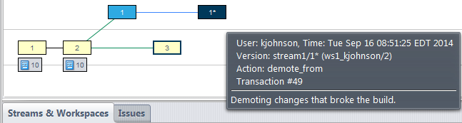 After you select a destination stream or workspace and click OK, the changes associated with the issue(s) are no longer present in the parent stream but are now active in the default group of the destination stream or workspace you specified.