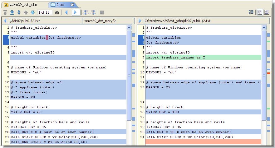 • Changed Section (blue background): Sometimes, the Diff tool decides that a text section in the "before" version has been revised, producing the corresponding section in the "after" version. The before and after sections are not necessarily the same length, in which case some empty space is displayed in one of the versions. Both the before and after sections appear with a blue background. Both sections contain red character highlights, indicating the first location in a line where the two versions differ: