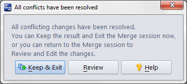 • Clicking Review continues the merge session. This enables you to review your work, change some of your merge decisions, and perform manual edits. At any time, you can click theKeep button in the Merge toolbar to complete the merge process.