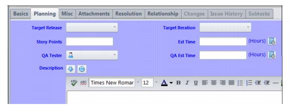 • The Issue History subtab displays a complete breakdown of how the issue record's field values have changed over time. See The Issue Form -- "Issue History" Subtab for more information.AccuRev Workflow is documented in the AccuRev® Web Interface User’s Guide, Version 2012.1 or later, but a brief summary of this toolbar is:Note: If an issue doesn't match any workflow stages, or is subject to multiple workflows, AccuRev displays a message to that effect where the buttons would otherwise appear. If an issue's fields don't match with the logic specified for a transition, the transition button appears, but it is grayed out until the user changes the fields required to bring the issue into compliance.To move from field to field, use the mouse or press Tab and Shift-Tab. To move from page to page in a multiple-page Issue form, click the subtab name (there is no keyboard accelerator).The Enter key confirms a menu choice or enters a line-break in a multiple-line text field. It does not perform field navigation. Within a multiple-line text field, the Tab key inserts a TAB character, rather than jumping to the next field.When an Issue form appears after you invoke Create Issue, you may notice that some fields already have values. AccuWork can include any number of such field initializations.If a field's label appears in red, it is a required field. You cannot Save the issue record until every required field has a value. (A text field has a value if it's non-empty; similarly, a multiple-choice listbox field has a value if it's not empty.) Some of those fields may have gotten their values through an automated field initialization.Each issue record has an integer identifier, its issue number. This number is unique within the depot (but not within the entire repository). AccuWork assigns the issue number automatically the first time the issue record is saved, and it cannot be changed thereafter. The issue number is stored in field issueNum. By default, the label for this field in an Issue form is Issue, but the edit-form designer can change the label for this field.Your entries in an Issue form are not stored in the issue record until you click theSave or