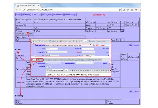 • Tracking: Tracking issues are sometimes required after you cross-promote and patch multiple issues to a destination stream, and you might choose to use them if for some reason you wish to have a patch operation (for example) tracked by its own unique issue rather than by a variant of an existing issue. See Tracking Issues for more information.Issue record relationships can be viewed only in the AccuWork GUI. The Issue form tables that display relationships are not included when you export an issue record (for viewing or printing). These tables are not included when you use the AccuWork command line interface (CLI) to dump the contents of an issue record. (See the AccuWork™ Command-Line Interface chapter in the AccuRev CLI User’s Guide.)When you create or delete a relationship between issue records, the change to both issue records is saved immediately. There is no need to invoke Save on the issue record. (TheSave button is not enabled in the edit-form toolbar.)