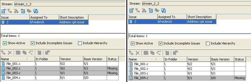 Reuse of Issues Across Streams Scenario: In the previous sections, you worked on issue #0002 in workspace stream_1_3_WS_1 and promoted the following files against it: • file_001.c • file_002.c But what if this issue also applied to a different release being handled in a different stream (in this case, the hierarchy under stream_2_1)? In that stream, the fix needs to be made in a different set of files: • file_002.c • file_003.c You perform the changes to these files in workspace stream_2_3_WS_2. Even worse, somebody else continues to work on issue #2 in the original stream and adds a new file named file_004.c which doesn’t even exist in Stream 2. Both developers promote their changes against the same issue, one from workspace stream_1_3_WS_1 and the other from stream_2_3_WS_2. Now the change package is incomplete in both streams: the modified versions of file_002.c and file_003.c are not available under Stream 1, nor does the new file_004.c exist under Stream 2. If you do a Show Active Issues in both of the parent streams, you see two different incomplete change packages, each missing different files. How do you fix it?: Don't try to cross-promote or merge the missing files. Instead: 1. Create a new issue for Stream 2. 2. Open the original issue and select the files which were added when promoted into Stream 2. 3. Right click and select Send to Issue. 4. Select the new issue created in Step 1 to send the selected file(s) to. You will now see the original issue as complete in Stream 1, and the new issue as complete in Stream 2. How do you prevent this from happening in the future?: Make it a policy to not use the same issue to address problems in multiple streams. If you need to fix the same issue in another stream, create a new issue for that stream and promote files against that issue.