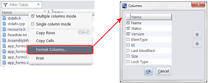 The columns AccuRev displays in tables vary across views. If you want, you can change the columns that are displayed using the Columns dialog box. To change the columns that are displayed in a table: