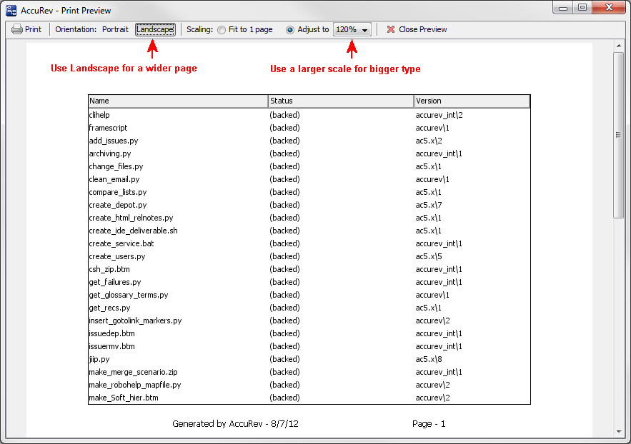 When you print a table, AccuRev displays a preview window that lets you see what the printed page will look like.