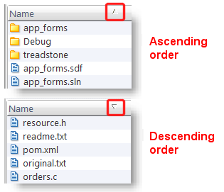 Note: In the Details pane of the File Browser (and any other table that lists file names and directory names in the same column), a lowest-to-highest sort places all directories before all files; a highest-to-lowest sort places all files before all directories.