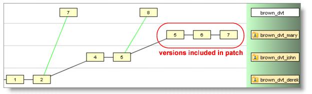 Derek decides to patch version brown_dvt_mary/7 into his workspace. AccuRev searches backward through the element’s ancestry, and includes the set of changes recently made in Mary’s workspace: this set includes brown_dvt_mary/5 through brown_dvt_mary/7; the patch doesn’t include the two versions created in workspace brown_dvt_john.